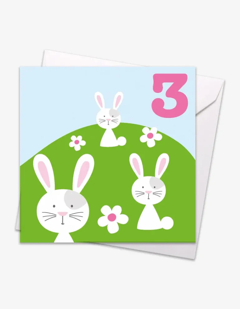 And then they were 3! Celebrate with our hopping bunny birthday card. All our occasion cards come with a plain white envelope and are printed in the UK from sustainable forests.