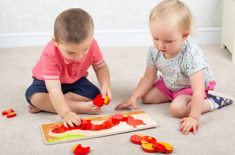 With 10 generously sized pieces, this chunky wooden puzzle is perfect for little hands to manipulate, explore, and put back into place. Not only does it help develop dexterity and matching skills, but it also improves concentration and counting skills.
