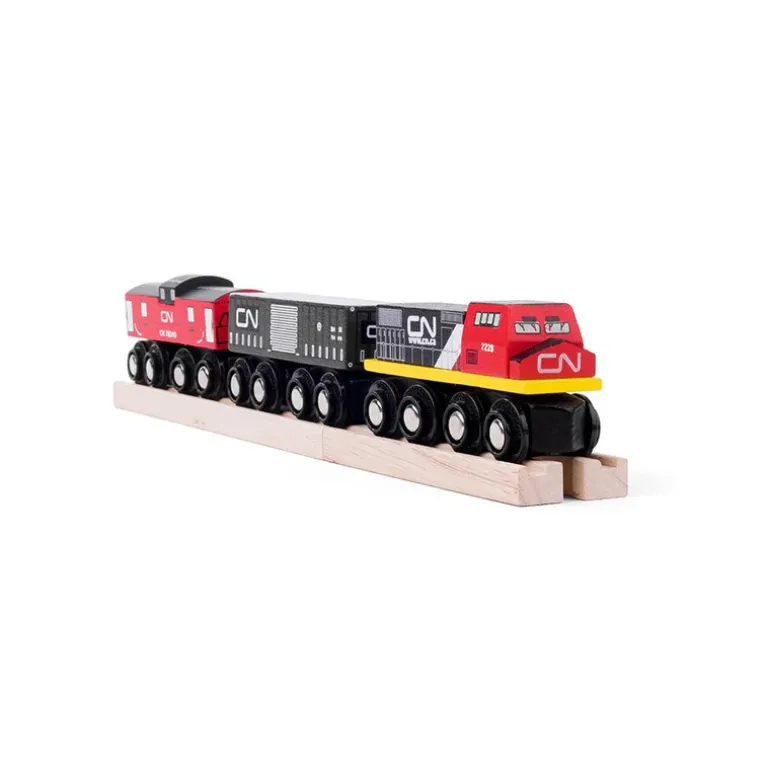 - Realistic CN wooden train engine with a caboose and goods wagon