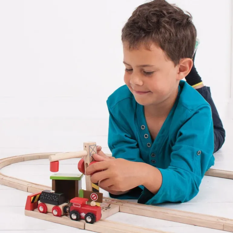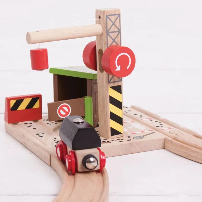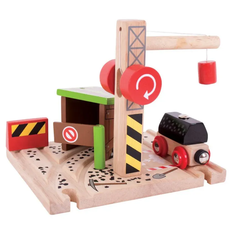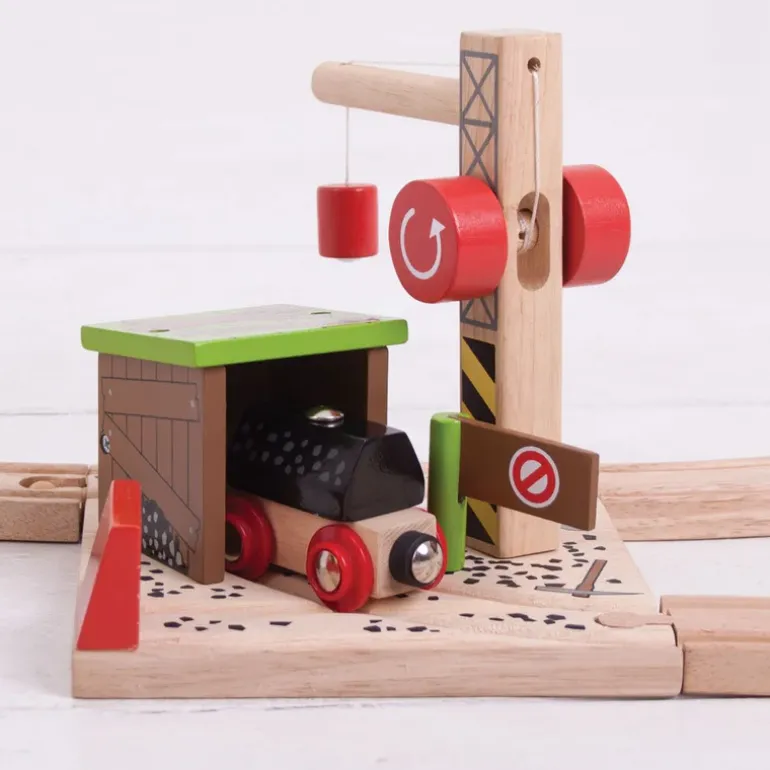 Help the miners by using the working wooden toy crane with a magnetic pulley to lift the coal load from the mine entrance to the rail carriage ready for transportation by rail.A fun wooden train set accessory, open and close the stop barrier to allow the carriage in and out of the mine entrance, or pull up next to the entrance at the end of the track.Encourages imagination, dexterity and co-ordination. Most other major wooden railway brands are compatible with Bigjigs Rail.