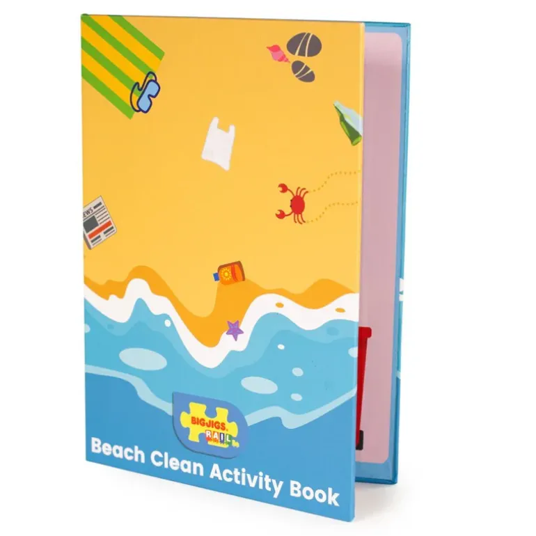 Oh, we do like to be beside the seaside! Enjoy a coastal adventure as the toy train and two carriages chug past a giant sandcastle tunnel, beach huts, sections of beach, beach-goers, cars and recycling bins with this very unique wooden train set. With 70 play pieces, this wooden railway is extensive and provides hours of fun. Kids can learn all about recycling whilst they play – little fingers need to pick up the magnetic pieces and pop them into the correct recycling sorting bins (cardboard, metal, plastic). The perfect eco-friendly toy, the fun doesn’t stop at the Coastal Clean Up Train Set… the magnetic items can also be mix and matched in the included recycling book, packed full of fun recycling facts.