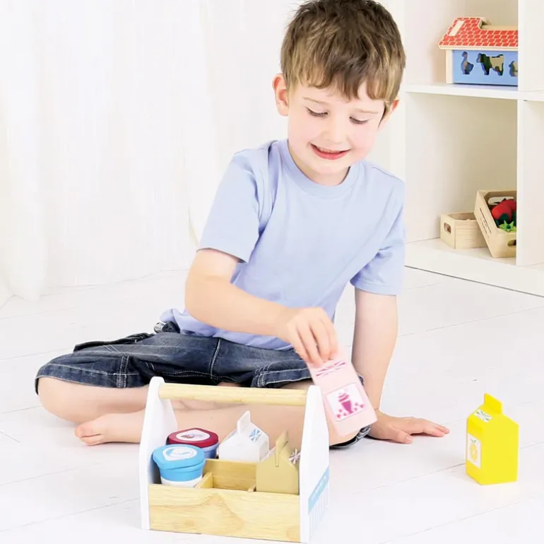 The ultimate wooden play food for a tea set or play kitchen! Nestled inside this easy to carry sturdy crate are four cartons – milk, orange juice, strawberry milkshake and chocolate milkshake – plus a pot of yoghurt and a pot of cream. Kids will be serving up a storm in no time with such a variety of dairy produce! Toy food is ideal for helping your little one to learn about the importance of a healthy and balanced diet, where our food comes from and how we prepare our meals. Once playtime is over, the wooden food can be stored back in the storage crate. Made from high quality, responsibly sourced materials. Conforms to current European safety standards.Dairy Delivery product features: