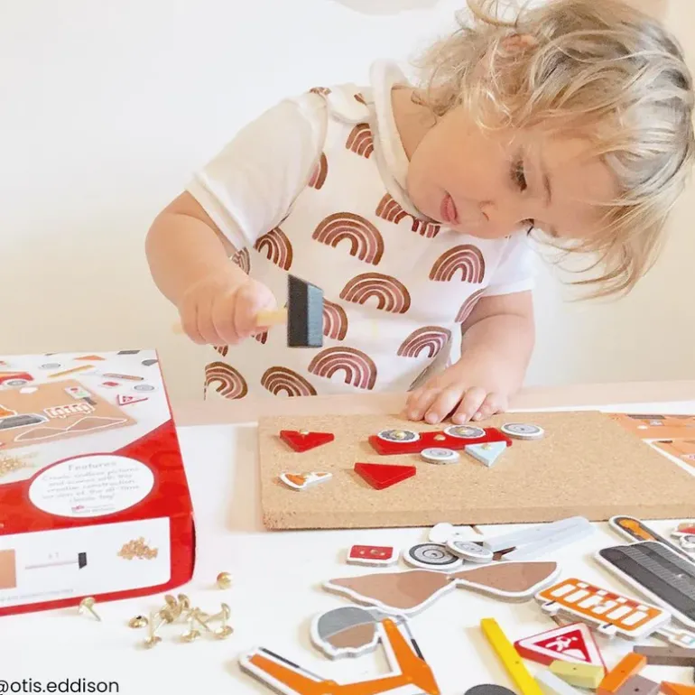 For generations, Pin-a-Shape art boards have been a beloved choice that never goes out of style! Using the hammer provided, you can mix and match the colourful wooden shapes and pin them onto the corkboard using the shiny pins included, creating countless construction scenes.