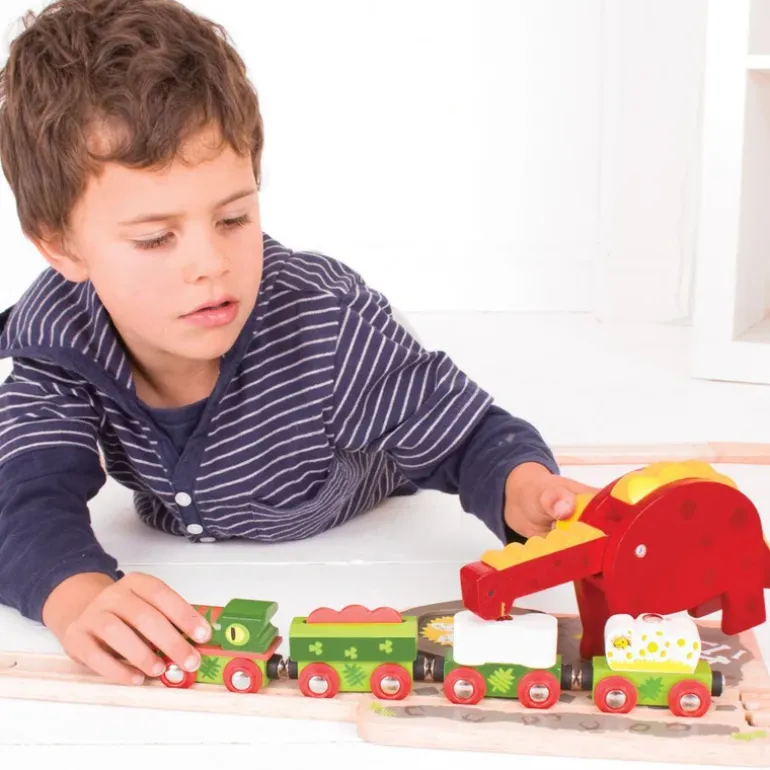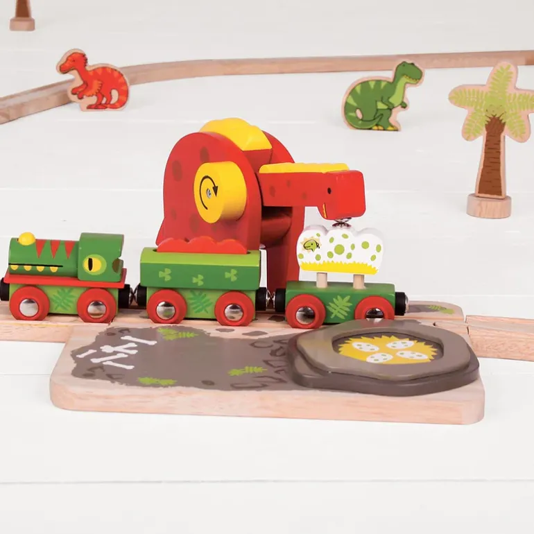 Go on your own prehistoric adventure with our totally roar-some Dino Crane. This fabulous Dino Crane combines a traditional wooden railway with a Jurassic design. Youngsters can transport the dinosaur eggs on the egg carriage and easily unload them using the dinosaur’s magnetic mouth. Keep your wooden train set in ‘eggcellent’ shape whilst the dinosaur eggs are unloaded from the wooden carriage. When are the baby dinosaurs going to hatch? Ideal for imaginative play times and introducing children to cause and effect as they wind the crane up and down. Most other major wooden railway brands are compatible with Bigjigs Rail.