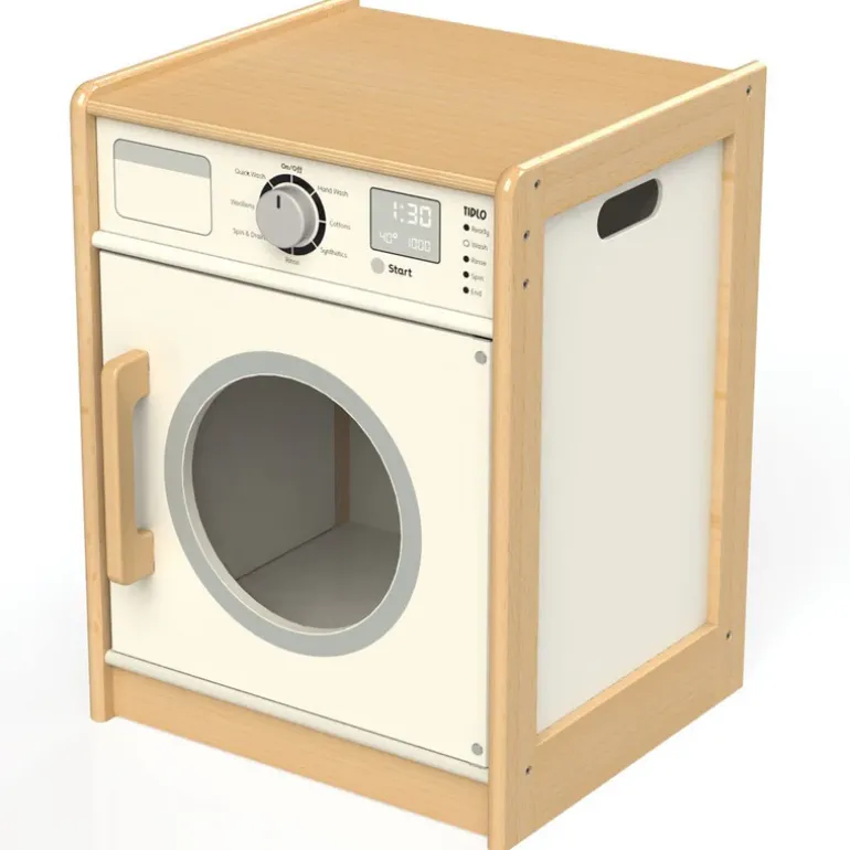 Everyone loves fresh and clean clothes to play in, so why not give yours a quick whirl around in the Tidlo Washing Machine! With clicking dials and an easy-open large front door, this wooden washing machine is a great addition to any play kitchen. The Tidlo wooden washing machine is also a great way to teach children about how we wash clothes, and that if we mix white and red our clothes will turn pink! There is even a view hole in the door so little ones can keep an eye out to make sure their clothes aren’t turning a different colour… Features carry handles. Encourages creative and imaginative role play. Combine with other wooden play kitchen appliances from Tidlo and create a full working kitchen! Requires adult assembly.