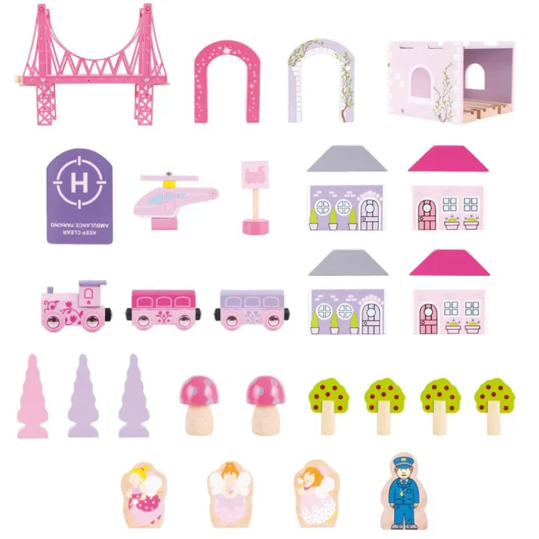 A fantastic wooden train set with a sprinkle of fairy dust! The fairies have come to town and the Fairy Town Pink Train Set is ready to depart to a magical fairytale land far, far away. Pinks, pastels and fairy figures all take centre stage with this wonderful wooden train set.
