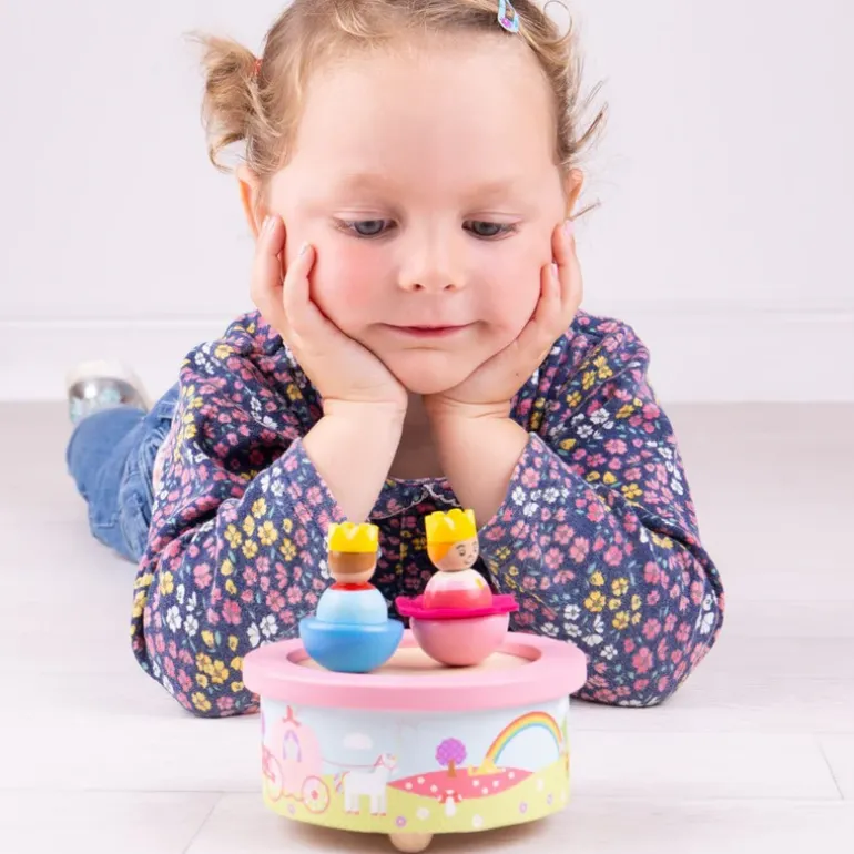 Wind the royal fantasy characters up and watch them go to the musical tune in our adorable Fantasy Music Box. This delightful wooden music box features a Prince and Princess who dance, wobble and spin to the tune of Small World, providing hours of fun. The royal characters are attached to the wooden music box base via hidden magnets, but can be easily removed for playing on the floor or table! A delightful addition to any playroom or nursery. Music boxes encourage creative and imaginative play.