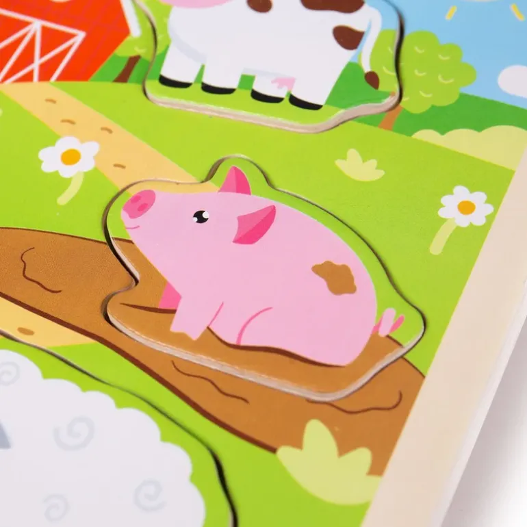 All the fun of the farm! Our Farm Sound Puzzle requires little fingers to place the farm animal puzzle pieces into the correct slots. When the correct piece is laid down, the jigsaw puzzle makes an animal sound. Sound puzzles are a fun way for children to learn about the different noises farm animals make – oink, cluck, moo and baa! This vibrant wooden puzzle is perfectly sized for little hands to grasp, examine and place and build their general knowledge. Four puzzle pieces. Helps to develop hand/eye coordination and dexterity.