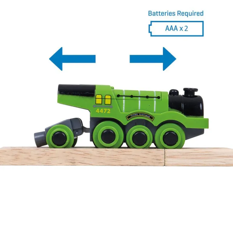 The Flying Scotsman is a delightful and authentic addition to any wooden train set! Requires 2 x AAA batteries (not included). It can pair up with other engines and carriages in the Bigjigs Rail range thanks to its magnetic couplings. And it’s also compatible with most other major wooden railway brands