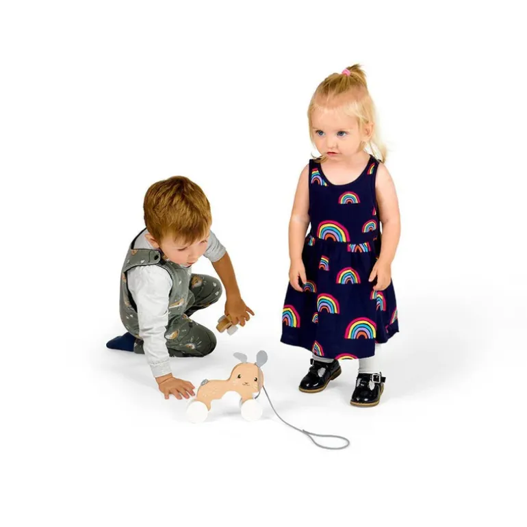 Mummy Bunny has a friendly face and a grey felt tail and ears for fun sensory play sessions. She also has a safe grey pull-cord to get her whizzing around. Baby Bunny can be manually pushed by little hands.