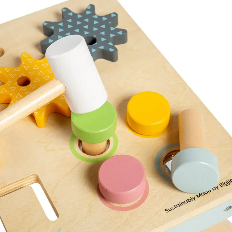 An activity table packed with plenty of things to do, little hands can… use the three wooden mallets to hammer in the chunky nail pegs, screw in the animal bolt heads, spin the wooden cogs, and slide the four numbered triangles down into the correct slots.