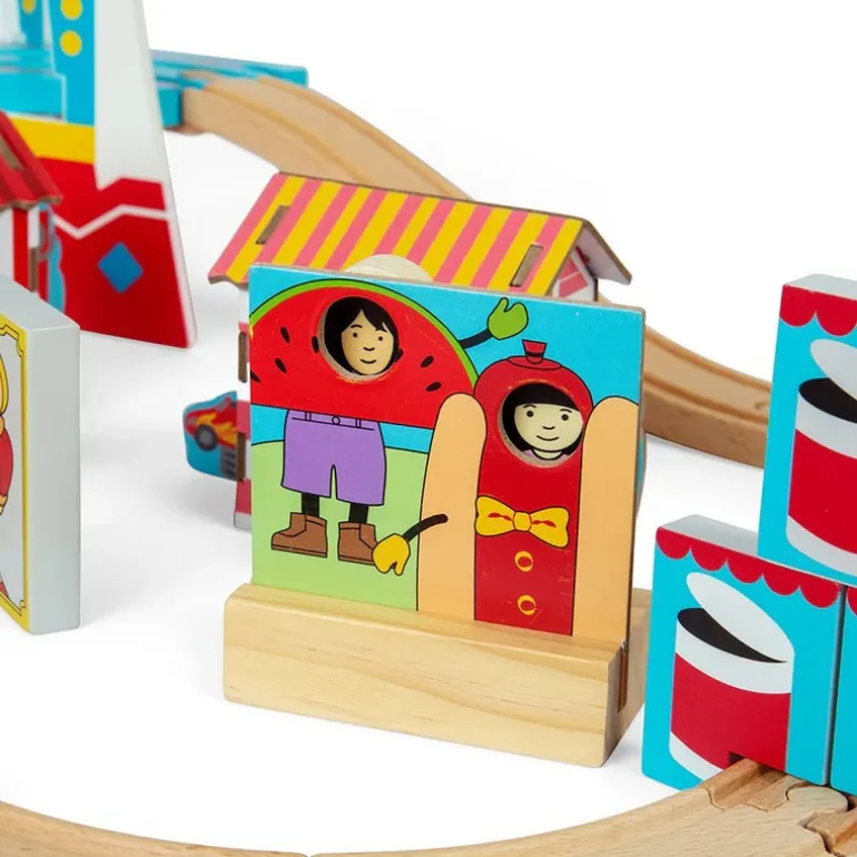 - 54-piece fairground-themed wooden train set