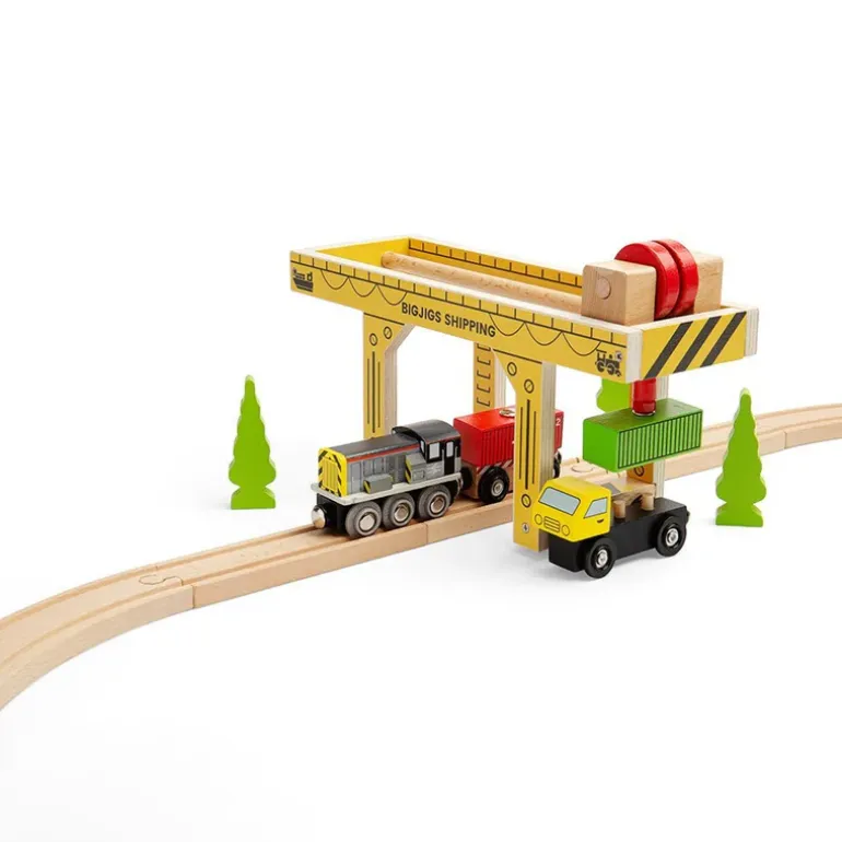 Wheel along the Bigjigs Rail Gantry Crane to unload your precious cargo! This wooden train toy features a working crane and one container lorry with a detachable load. Simply connect the crane’s magnetic hoist to the lorry load and turn the red wheel to lift it off.