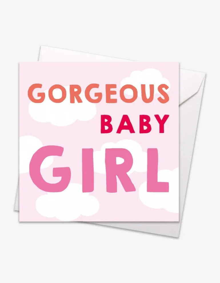 Our gorgeous baby girl card features our bold font on a background of pink sky and white fluffy clouds.