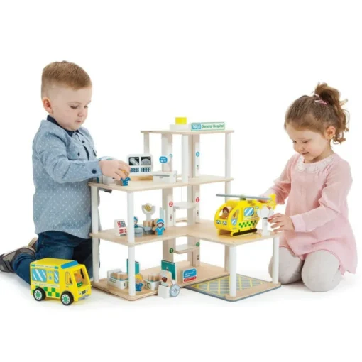 Nurse your favourite patients back to health at the Tidlo General Toy Hospital! There are no lengthy waiting times at this hospital as there are lots of doctors and nurses on hand and ready for any emergency.This 30-piece hospital toys set includes an air ambulance, road ambulance, ward beds, privacy screens, surgery lights and tables, a heart monitor, MRI scanner and X-Ray machine, a clicking elevator, helicopter landing pad, and an A&E ambulance drop off point. Plus a wheelchair, stretchers, and five patients.Three floors packed with play value. Toy hospitals are a great way to encourage creative and imaginative play sessions. Develops hand/eye coordination, fine motor skills and dexterity. Requires adult assembly.Conforms to current European safety standards. Consists of 30 play pieces.