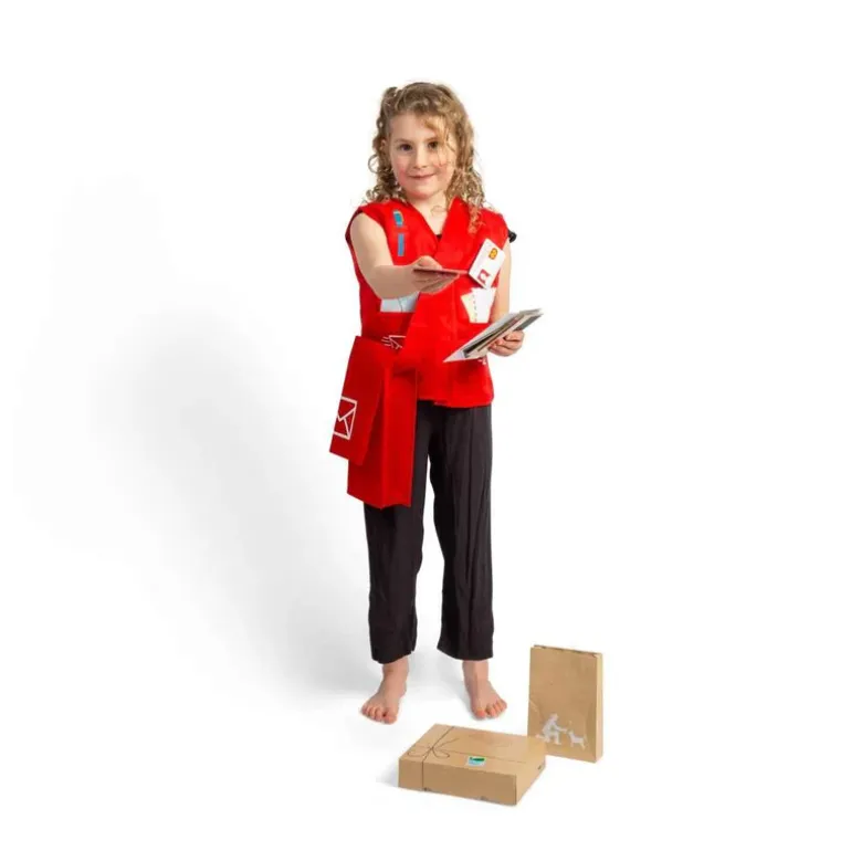 Experience the wonders of imaginative play with our high-quality Mail Carrier Dress Up Set for young posties! This set includes a red mailbag, vest, name badge, and playful accessories such as parcels, letters, postcards, and even dog treats for those furry friends on the postal route.