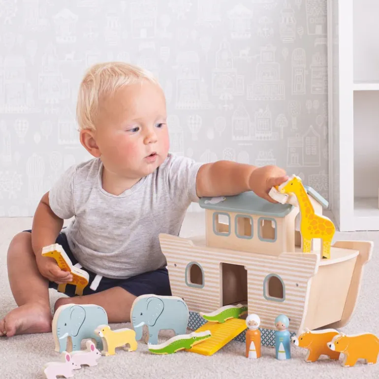 Let the animals in two-by-two on our beautifully coloured FSC® Wooden Noah’s Ark. The foldable side ramp makes it easy for animals to board the boat. This wooden toy is a fantastic way of developing kids’ imaginations through creative role-play.