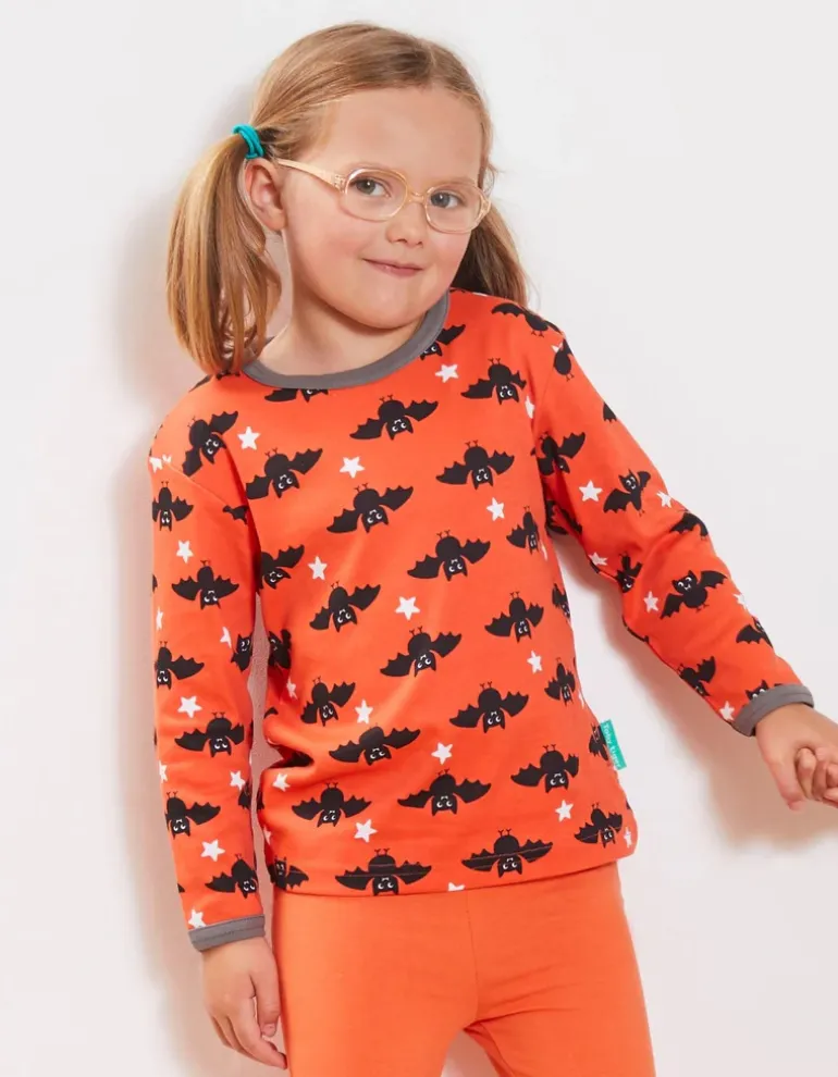 Get your spook on with our bright and batty orange organic T-shirt! Made from super soft organic cotton, this long-sleeved top will keep little ones super cosy, and our smaller sizes have neck poppers so you don’t get in a flap when changing. Looks great with our leggings or joggers. Want to dress up for Halloween and beyond? Check out our full batty organic childrenswear collection online at Toby Tiger.
