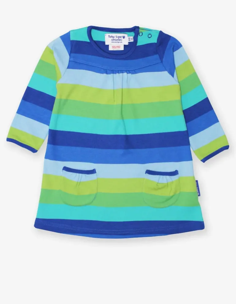 A Toby Tiger classic! Featuring our much-loved bold chunky stripes in super soft 100% certified organic cotton, this lovely dress features two handy little pockets just perfect for keeping fave trinkets snug when out and about. Looks great teamed with our basic blue or green leggings.