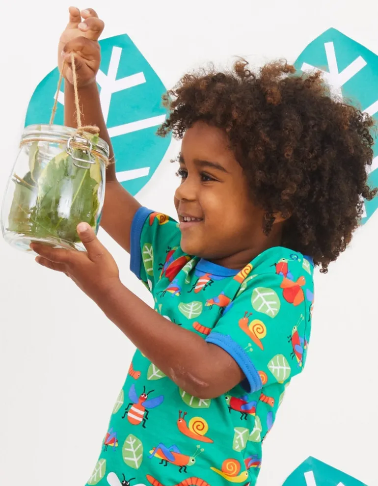 Embrace a bug’s life as we pay homage to our favourite insects. Buzzy bees, wriggly worms, swirly snails and more feature on our grass-green organic cotton colourful kids T-shirt. Our smaller sizes come with poppers on the neck to make changing that little bit easier. Looks fab under a pair of our organic dungarees, shorts or leggings. Got the bug for this print? Check out our full bug collection of organic childrenswear online at Toby Tiger.