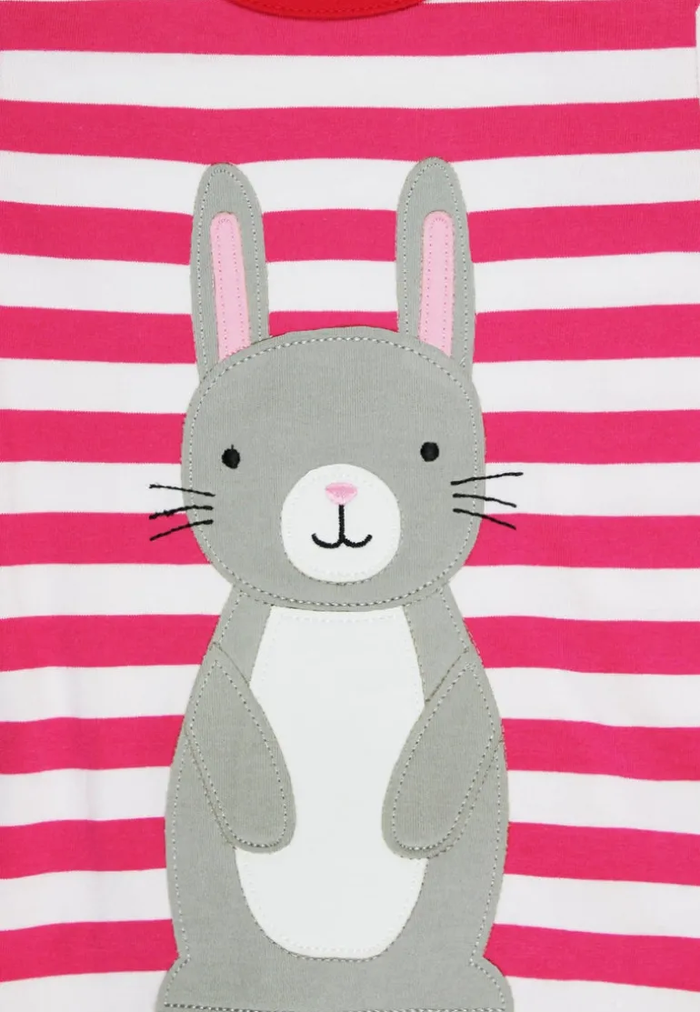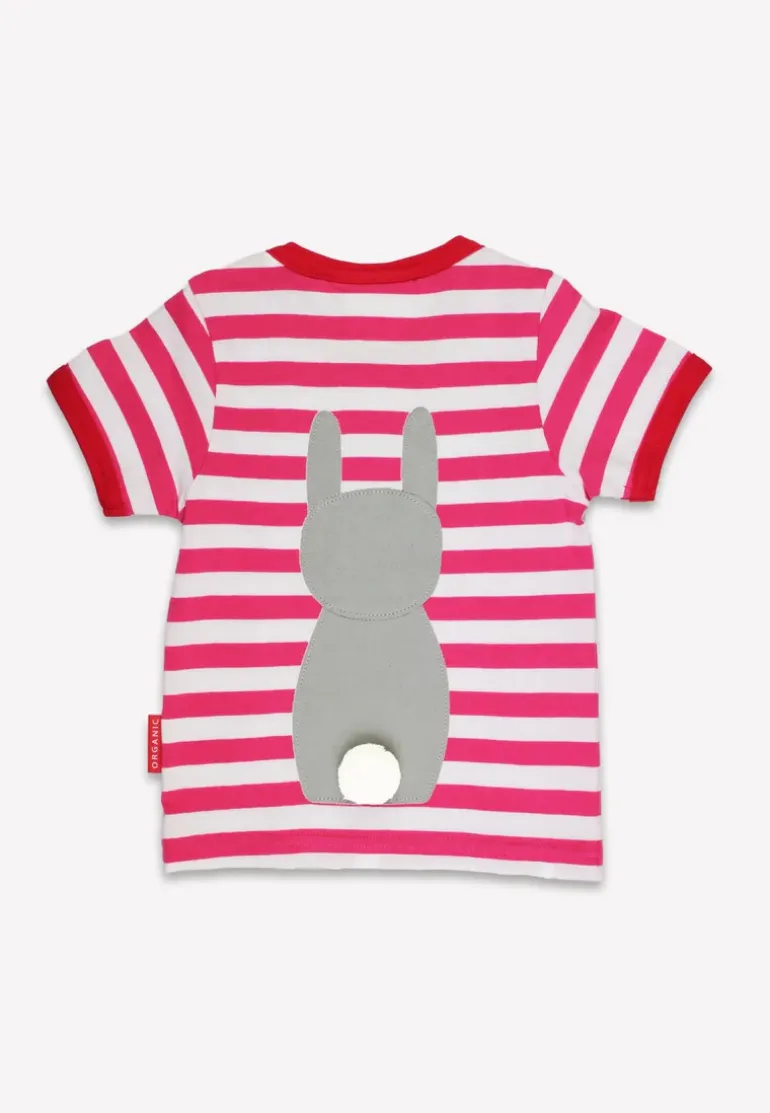Get your kiddo hopping with our Organic Bunny Applique T-Shirt! Made from organic materials and fitting toddlers and kids up to 8 years old, this short-sleeved shirt is perfect for any little one. With pink and white stripes and a removable pom pom bunny tail, it’s both cute and practical.