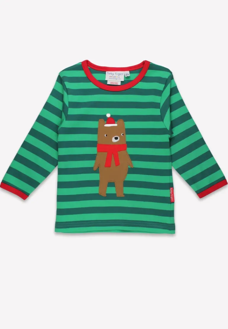 Get into the Christmas spirit with our Organic Christmas Bear Applique Long-Sleeved T-Shirt! This festive shirt features a cute bear wearing a winter hat and scarf, perfect for kids from 6 months to 8 years old. The dark and light green stripes with red trim add an extra touch of Christmas cheer. Made with organic materials, it’s a great choice for the environment and your little one.