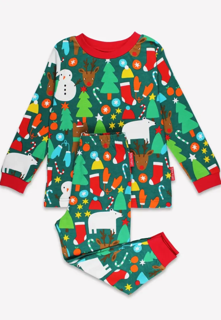 Unleash your holiday spirit with our Organic Christmas Bear Print Pyjamas! Made from 100% GOTS-certified organic cotton, these super soft and environmentally friendly pyjamas feature a unique Toby Tiger design in festive green with red trim. Machine washable and AZO-free, these pyjamas are perfect for a cosy and eco-friendly Christmas.