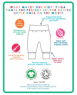 Snappy dressers love our stretchy kids yoga pants. Fidgety little legs keep comfy and cool, and this colourful crocodile print featuring matching green elasticated waist and ankle bands keeps things snug. Team with our matching organic T-shirt or appliques – find more of our croc-themed, breathable organic cotton for kids online.