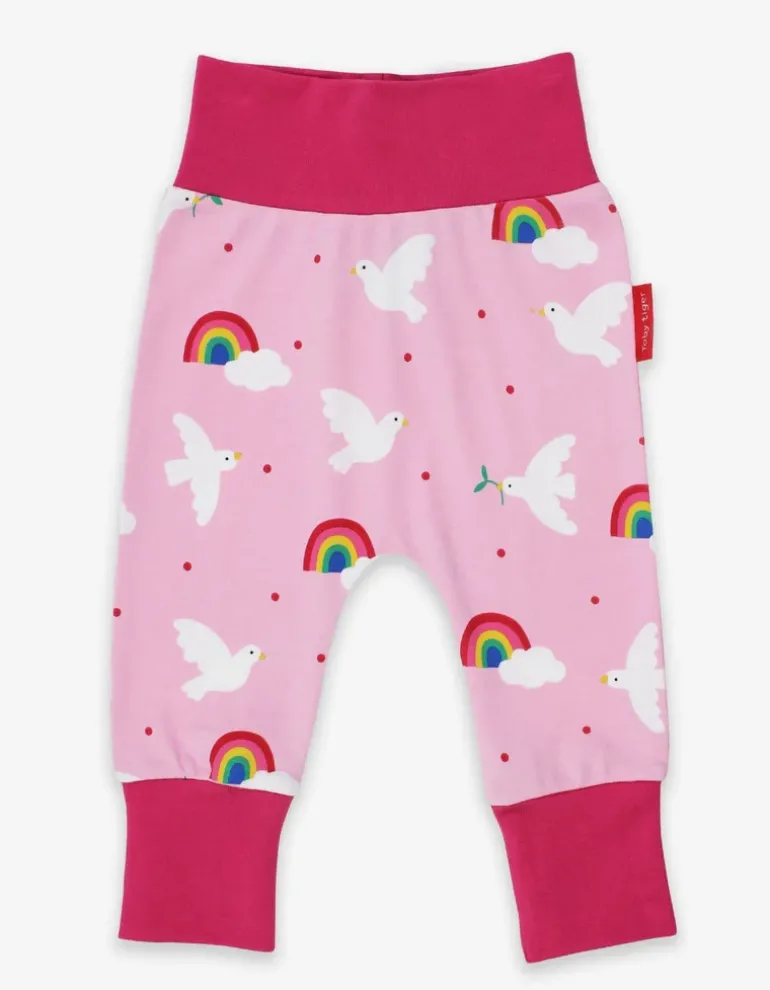 Keep busy little legs comfy and cool with our super soft and stretchy organic yoga pants. This rainbow and dove pair features contrasting pink elasticated waist and ankle bands and looks fab with our matching organic printed or applique T-shirts. If you love the doves, check out our full pure organic cotton childrenswear online.