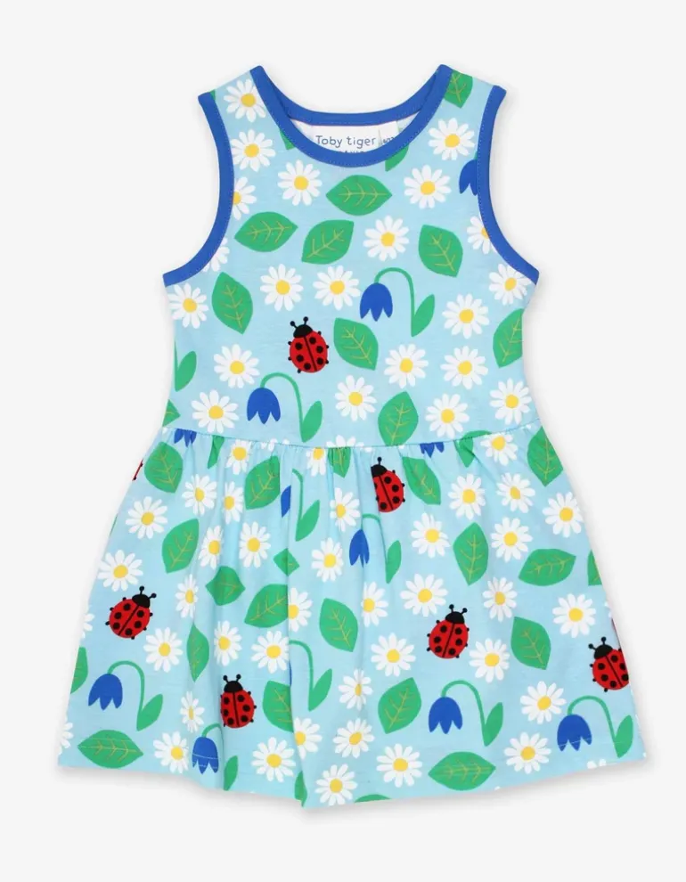 Little ones will love to spin and whirl in this spring-inspired organic cotton dress. And the fun doesn’t stop there: our wild and wonderful meadow is packed with pretty daisies and blooming bluebells – how many ladybirds can you spot? Made from our super soft 100% GOTS-certified organic cotton with a full skirt and stylish sky-blue trim, your little one will not only look the part, but keep their cool on a warm sunny day. Going wild for this print? Check out our English Garden organic childrenswear collection online at Toby Tiger.