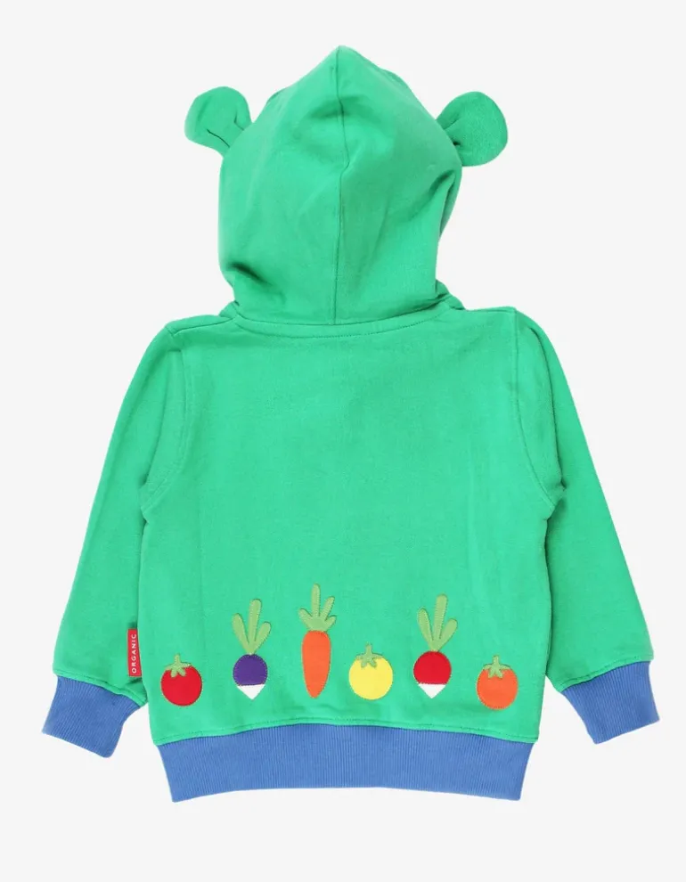 This soft, bold green zip-up hoodie with contrasting blue trim features fun ‘frog eyes’ and spring-inspired stitched appliques for little frogs to spot.