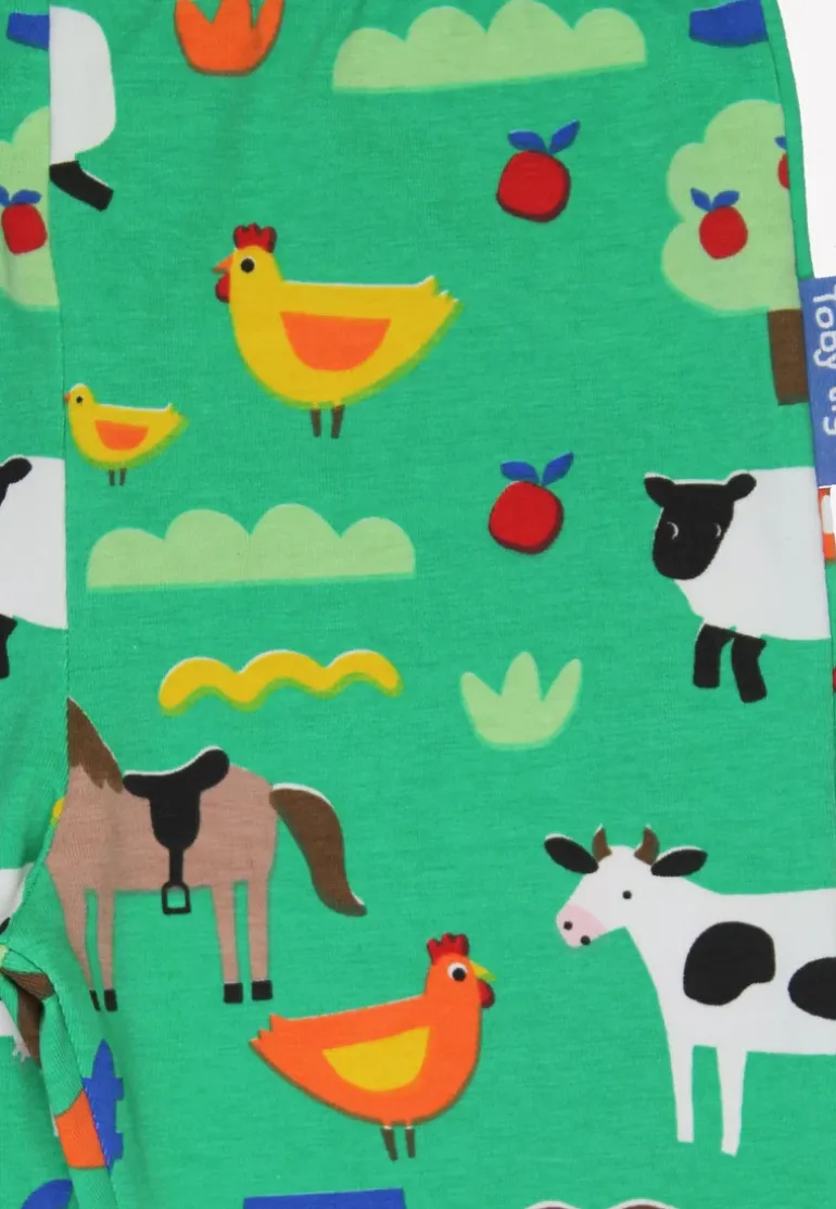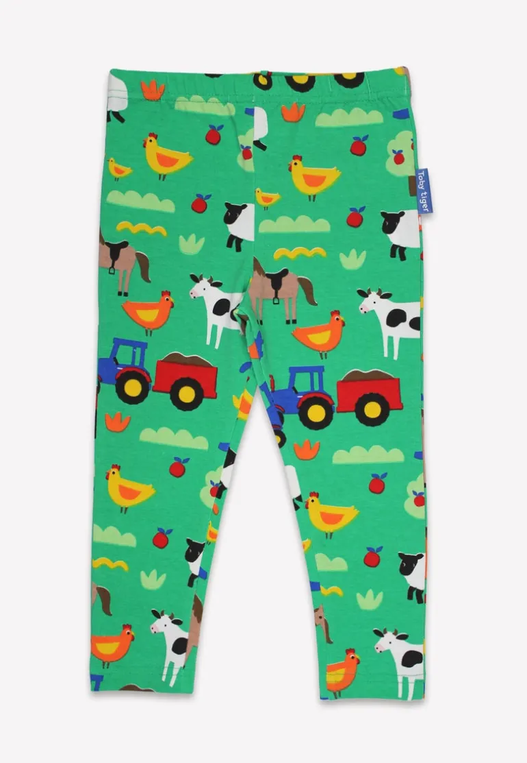 Get ready to roam the countryside in style with our Organic Hillside Print Leggings. These playful leggings feature an adorable farm print that includes tractors, cows, sheep, horses, chickens, apple trees, and more!
