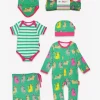 Introducing the Organic Kitten Print Baby Bundle – purr-fect for your little one! Made from 100% soft and organic cotton, this set includes a green babygrow, striped baby body, hat, and bag. Plus, a dribble bib and 2-pack muslin. Machine washable and environmentally friendly, making a great gift for any baby. Me-wow!