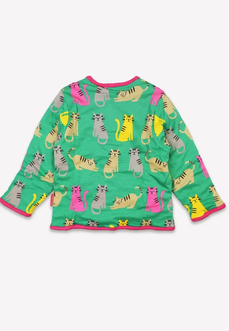 Keep your little one stylish and comfortable with our Organic Kitten Print Reversible Jacket. Made from 100% GOTS-certified organic cotton, this green jacket features a cute grey, pink, and yellow kitten print with pink trim. The cosy fleece-lined inside and side pocket adds convenience and warmth. Environmentally friendly with AZO-free dyes and machine washable.