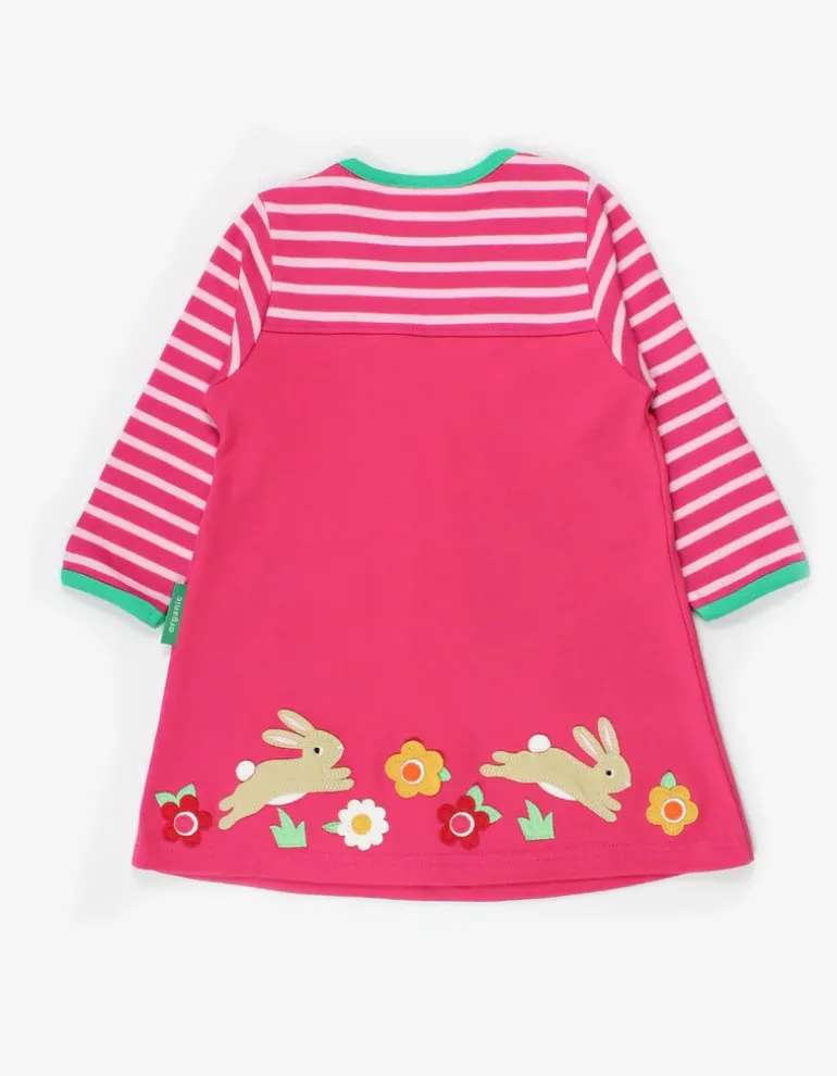 Let’s get dressed for spring! Look no further than this bunny applique long-sleeved organic dress. Bunnies hopping about the flowers and a daisy chain neckline stand out on the dusky pink organic cotton, while the contrasting stripy sleeves adds extra style. Find more of our feel-good organic spring wear online.