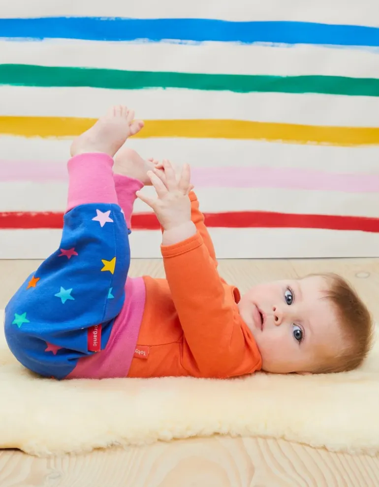 Curl up, stretch, explore or play in these versatile star print organic baby yoga pants! Made from super soft 100% certified organic cotton, the wide elasticated waist and ankle bands make them super comfy and easy to wear. Pair with a cool organic T-shirt from our applique range for a great outfit. A stylish wardrobe staple! Are you a fan of this print? Check out our entire organic childrenswear Rainbow Unicorn collection online at Toby Tiger.