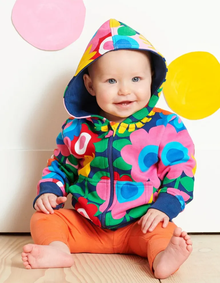 Feeling groovy? Give a nod to the 60s with our funky flower power hoodie. Bursting with colour and blooming-lovely flowers, the stylish navy trim on the cuffs and waistband finishes this soft 100% certified organic cotton number off perfectly. Take a look at our bright plain leggings and t-shirts for a super-funky look!