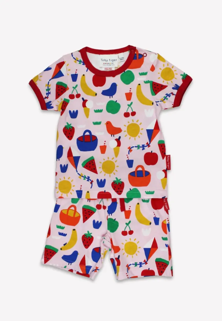 Get ready for a cosy and playful night’s sleep with our Organic Picnic Print Short Pyjamas! Made with 100% GOTS-organic cotton, this set features a pink jersey t-shirt and shorts with a fun picnic-themed print. The elasticated waistband adds extra comfort while the set can also be worn as a stylish co-ord on a hot summer day. Perfect for the quirky and fun-loving sleeper!