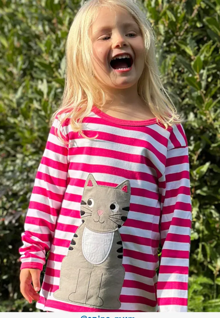 This organic pink kitten t-shirt is the purrfect addition to any cat-loving kid’s wardrobe. Featuring a playful grey applique cat with a detachable tail on the back, it adds a fun and unique touch to any outfit. Made with organic materials, it’s also an eco-friendly choice. Meow!