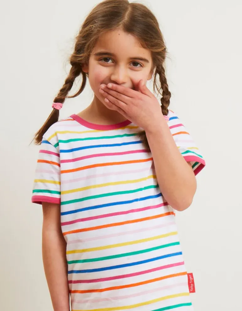 We love stripes and rainbows – so we put them together! Made from 100% certified organic cotton with pink trim, these are great teamed with a pair of our basic leggings or yoga pants to complete the look. Our smaller sizes have poppers on the neckline for easy changing – result!