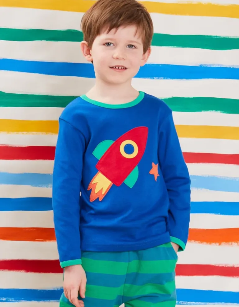 Buckle up for a space adventure with this soft-as-can-be rocket applique organic T-shirt. Cosy warm organic cotton and neck poppers on our smaller sizes means it will be a firm fave all-round. Looks great teamed with organic joggers from our Basics range and our fun Playtime Mix-Up print, which you can find online at Toby Tiger.