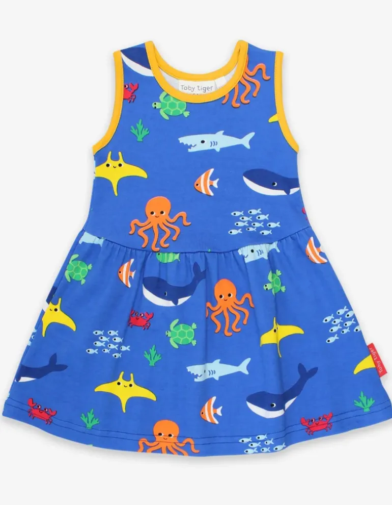 Dive into summer with our ocean-inspired short sleeve organic summer dress. Perfect for whirling and twirling, our super soft 100% certified organic cotton keeps little ones cool as they glide around to show off the deep-sea greats. Love life under the sea? Dive into our world of ocean-inspired organic clothing for kids!