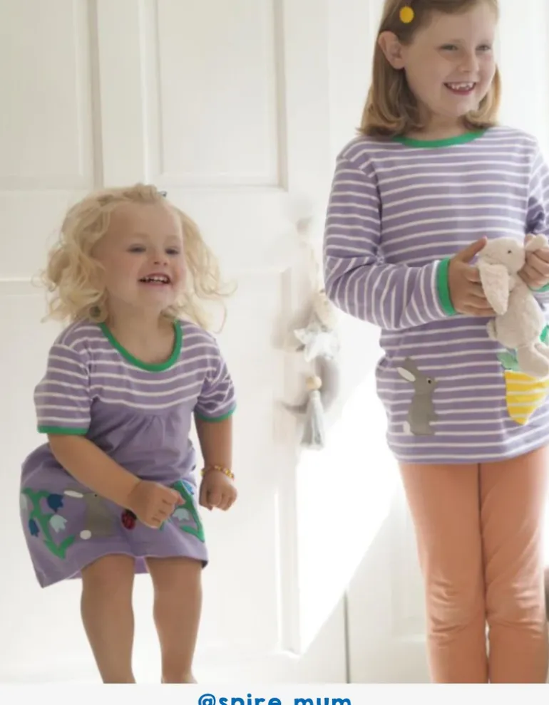 Our crop of appliques showcases the very best of spring on this organic kids’ T-shirt dress. Think blooming bluebells and dandelions with a curious bunny and bold ladybird, adding fun and colour on a backdrop of lilac. Extra style points include the contrasting stripy top half and a grass-green trim. It goes great with a pair of our organic leggings and, on chillier days, team it with a matching hoodie! Check out our full Spring collection.