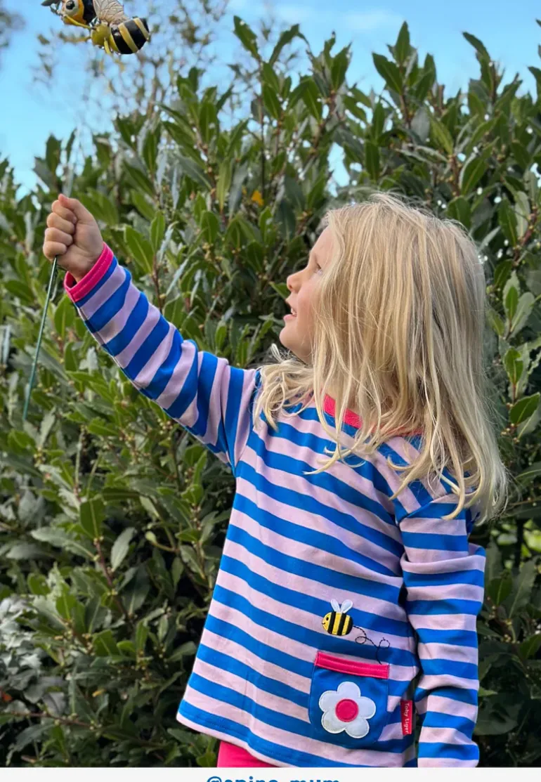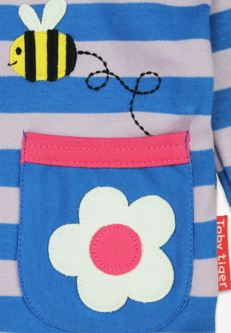 Get your little ones buzzing with this Organic Striped Daisy Applique Long-Sleeved T-shirt! Made from soft organic cotton, this blue and lilac striped shirt features a fun daisy applique side pocket with a cute bee flying out. Perfect for nature lovers and playful kids alike!