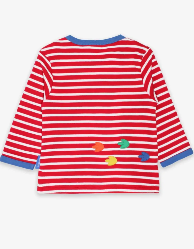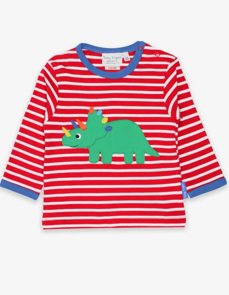 Here we have the lesser known multi-coloured triceratops. With her colourful horns and rainbow frill, she’s happily tucking into her healthy plant-based treat. Talking of treats, this long-sleeved stripy organic cotton T-shirt will keep your little one feeling cosy and snug. Our smaller sizes have neck popper fastenings – you’re welcome!
