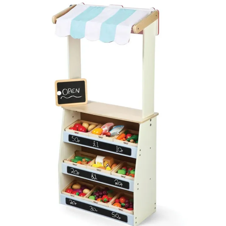 Ignite imagination and creativity. The Shop features a market stall design with a fabric roof and countertop area. Plus, 3 angled shelves that will hold the Tidlo Food Crates (sold separately), and a removable chalk panel.