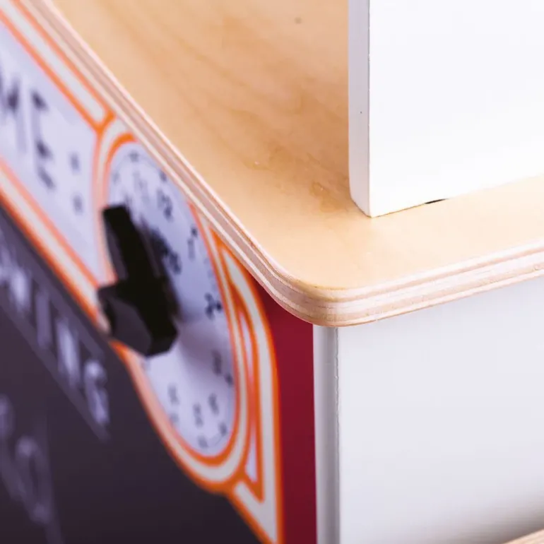 Simply raise the theatre curtain with the rotating, clicking dial and reverse the fabric to reveal the market stall roof. What to play today? Shall we put on a show for Mum and Dad? Or, open up the shop so friends and family can stock up on play food!