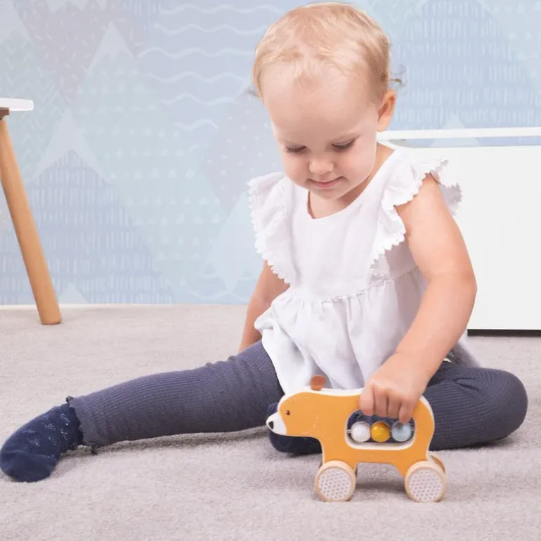 Our adorable FSC® Certified Push Along Bear helps little ones to develop their fine motor skills! The sturdy wheels roll smoothly along the floor and when it’s time for the bear to rest, busy little fingers can play with the three wooden beads in its belly.