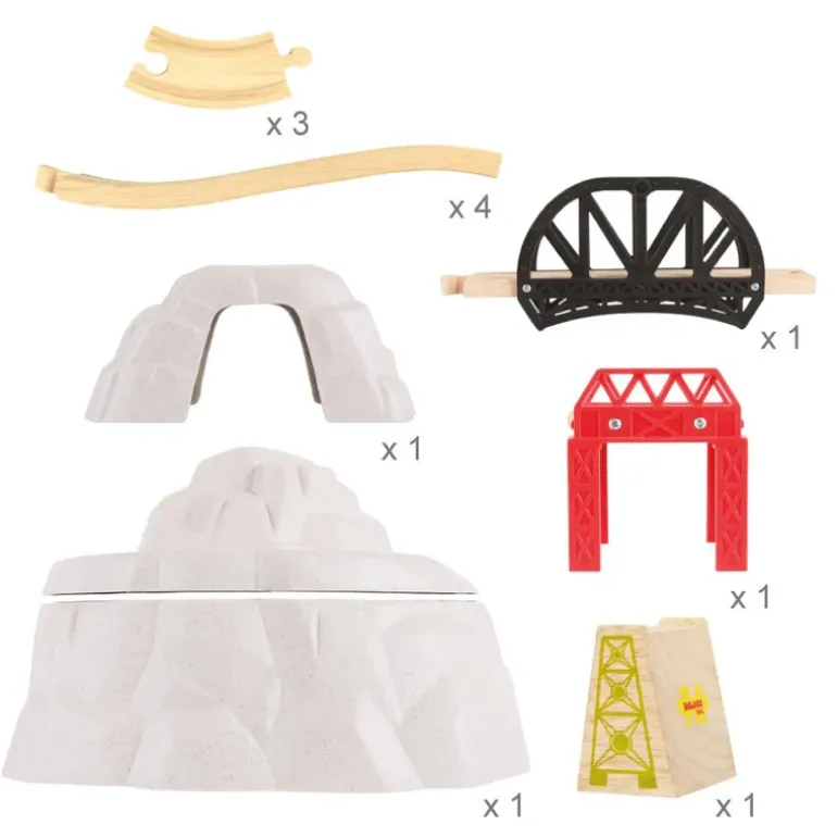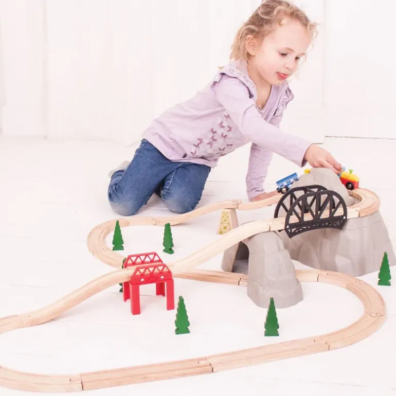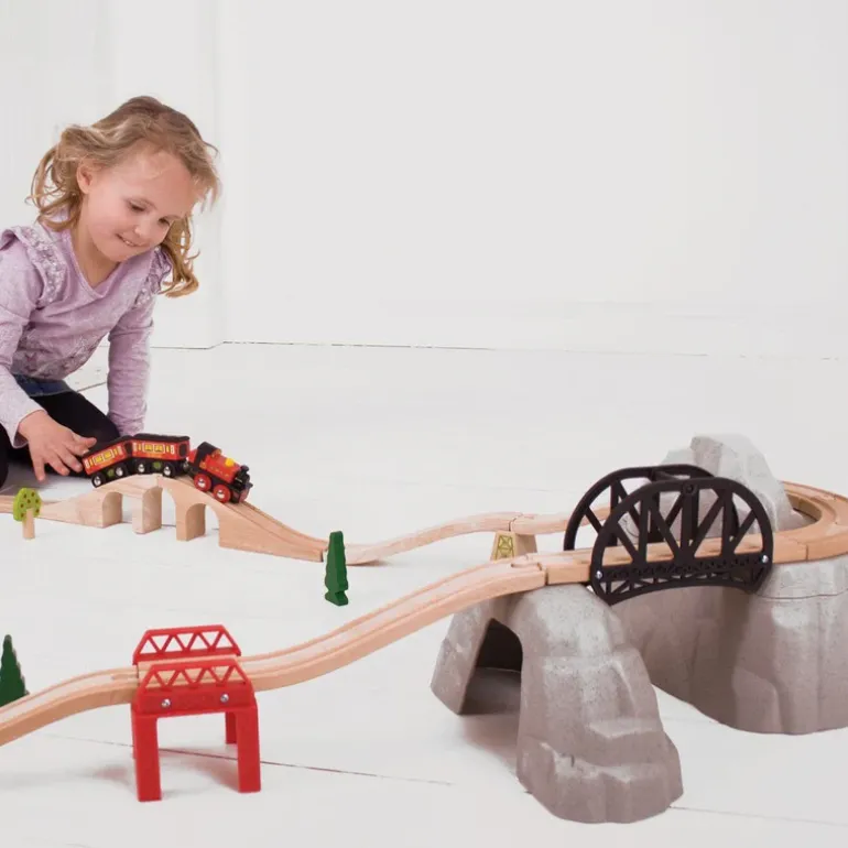 Our Rocky Mountain wooden train accessory takes wooden train sets to new heights! No mountain is too great a challenge for energetic young adventurers! Includes wooden train track and supports as well as 12 play pieces in total. 12 pieces of wooden train set accessories that includes bridge segments, ascending/descending track segments, track support and of course, the Rocky Mountain! Pair with our Mountain Wooden Train Set for lots of rocky rail adventures. Most other major wooden railway brands are compatible with Bigjigs Rail.