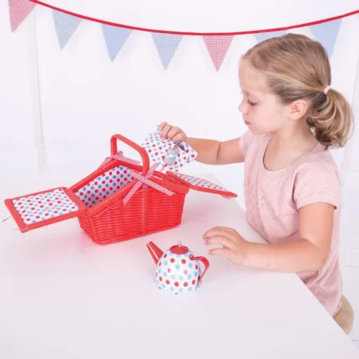 This delightful Spotted Kids Tea Set includes a red wicker picnic basket containing four cups and saucers, a teapot with a removable lid, four side plates, and four teaspoons in their own polka dot wrap.The Children’s Tea Set features everything your little one needs to host the perfect tea party for friends and family. The Red Wicker Picnic Basket makes it a great travel companion, and means your little host can ensure the set is stored away safely!A great way to encourage creative and imaginative role play.